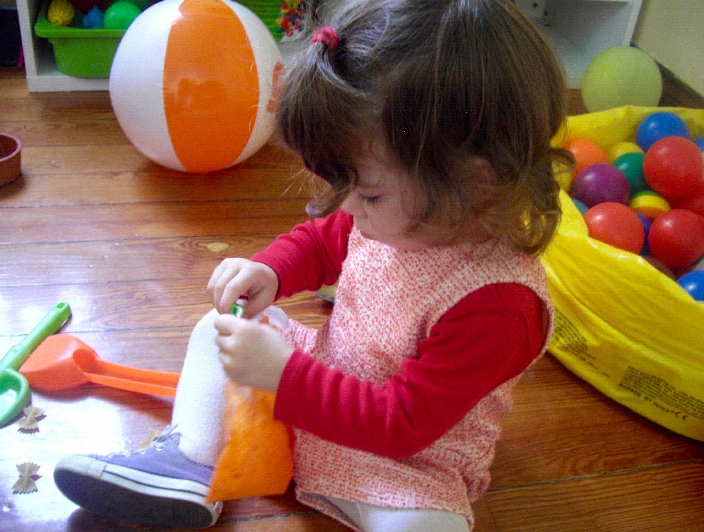 Then, we shook the bags. Babies observed that pasta pieces soon started to disappear! Babies tried then to identify the new content of the bags, by using all their senses.